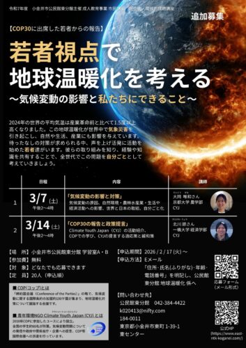 - 【追加募集】公民館東分館 市民講座「若者視点で地球温暖化を考える~気候変動の影響と私たちにできること~」