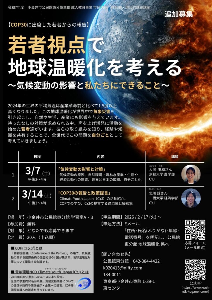 【追加募集】公民館東分館 市民講座「若者視点で地球温暖化を考える~気候変動の影響と私たちにできること~」