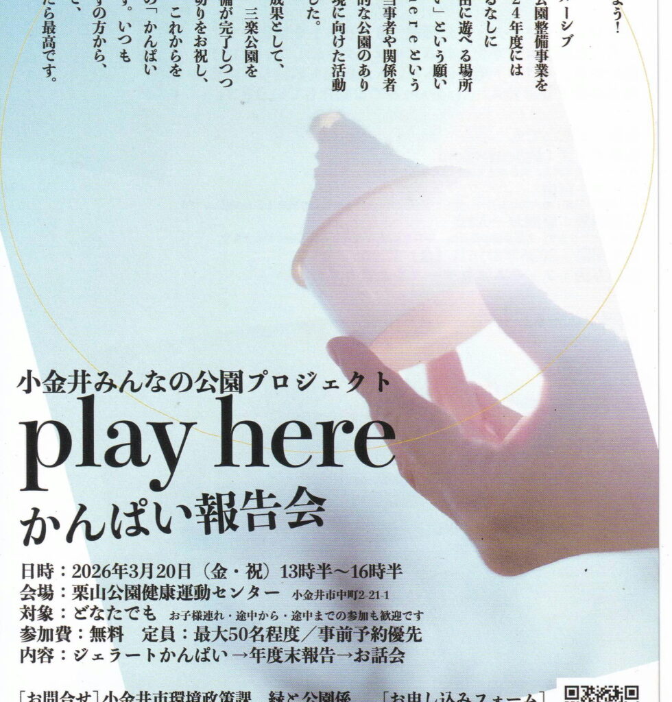 催し・イベント・行事・活動 2026.03.20投稿者:レキGさん Vol.4320 インクルーシブデザインのジェラードでかんぱい報告会が開かれました。 公園を誰もが自由に遊べる場所にする願いを込めたplay here…